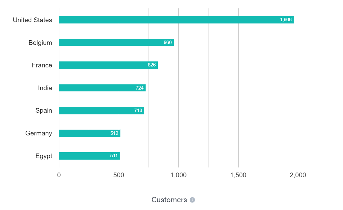The top three geographies of Odoo for enterprise-resource-planning-erp are the United States with 1,966(26.15%), Belgium with 960(12.77%), France with 826(10.99%) customers respectively.