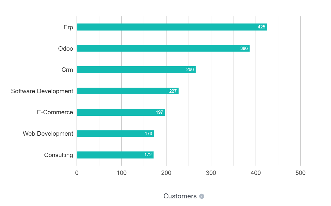 The three top industries that use Odoo for Enterprise Resource Planning (ERP) are ERP (425), Odoo (386), CRM (266).
