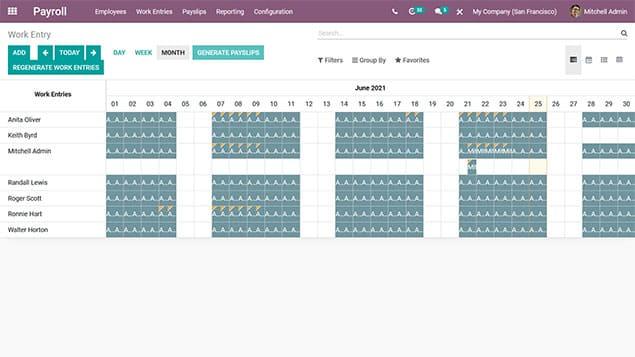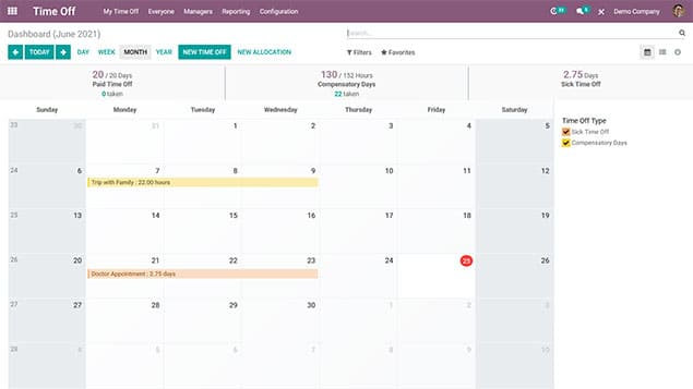 The employee leaves, time offs and attendance can be managed by the dedicated modules available.